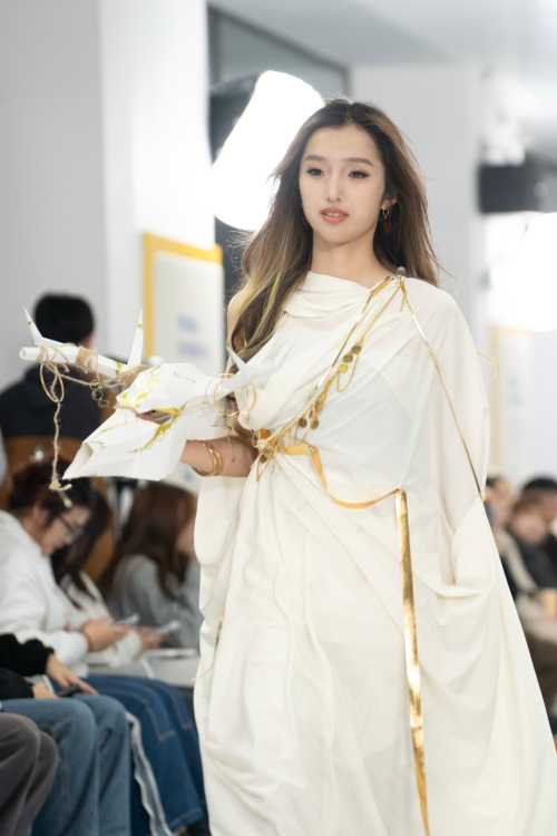 秀场结束后,2024级参展学生黄诗琪分享了其设计灵感。她表示,本学期的学习让她注重审美、理论与实践的结合,创作出既美观又实用的服装。此次设计主题为“白梦”,寓意着纯洁与无限可能。她希望作品能唤起人们对美好生活的追求,并表达简约个性的生活观。在材料选择上,她强调可持续性,用天然纤维和回收的快递包装袋,使废弃塑料制品重获新生、物尽其用,让观众在欣赏设计的同时,也能感受到对环境的尊重和保护。