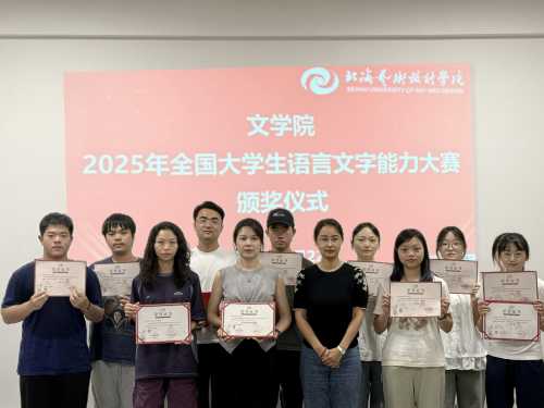 颁奖仪式上,学院领导为获奖师生颁发证书并表示祝贺。本次大赛文学院学子表现突出,共获得专业组奖项13项。其中,黄妍馨同学荣获全国决赛三等奖,涂煜昊同学获得广西赛区一等奖,黄妍馨等2名同学获得广西赛区二等奖,卢群等9名同学获广西赛区三等奖。陈文斌等3名教师获“优秀指导教师”称号。这些奖项不仅体现了学子们扎实的语言文字功底,也展现了文学院教师人才培养的显著成效。此外,文学院凭借出色的赛事组织工作,被大赛组委会授予“优秀组织单位”荣誉称号。