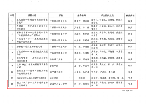 其中北海艺术设计学院美术学院教师韩洋指导的项目“点星造物——全媒体时代非遗手作工艺创新实践者”荣获本科组铜奖,由韩洋、康宗祁老师指导的项目“侗上‘筑’梦——助力非遗技艺传承实践教育”荣获本科组铜奖。