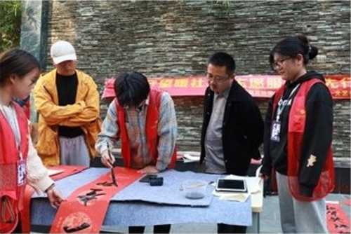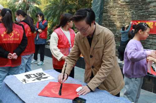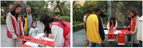 书法学院党支部书记喻广林、党支部副书记左云飞、美术学院学生第一支部副书记许荣军、书法学院学工办主任兼分团委书记李家琪、书法学院教研室副主任张天赋,书法学院教师石建玲,书法学院教师江威龙以及美术学院和书法学院的部分学生参与活动。他们充分发挥自身的专业优势,共同为社区居民送来新春祝福,让社区充满浓浓的节日气息。此外,活动也受到校、院领导的支持与关注,校党委副书记彭仁、美术学院执行院长龚为莅临现场指导。在这个团圆与祈福的冬至时节,两院师生们以笔为媒,以墨传情,为社区居民送上最真挚的祝福。