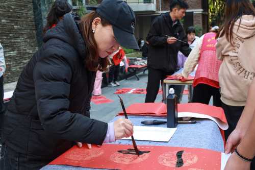 活动现场,气氛温馨又热烈,师生们热情洋溢,挥毫泼墨。居民们精心挑选心仪的春联内容,有表达对来年的祝福的“一帆风顺年年好,万事如意步步高”,寓意着新的一年里事事顺遂、步步高升;也有充满诗意的“春风得意马蹄疾,一日看尽长安花”,让人仿佛置身于繁花似锦的春日,感受着生活的美好与希望。随着笔锋的流转,一幅幅字体灵动、苍劲有力的新春对联与“福”字跃然纸上,将美好祝愿凝聚于纸张之间,化作一张张寓意平安和谐、吉祥如意的书法春联,展现了辞旧迎新的美好愿景。