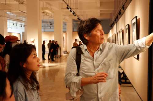 北海市美术家协会主席肖畅恒讲话,他表示很高兴能与北海的高校进行互动,并预祝本次展览成功。