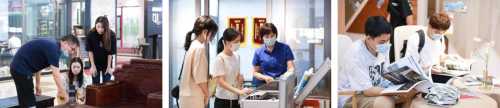 目光跟随第一批学生而至,踏入门店,其各式品质材料、高新技术、装饰搭配应接不暇。此次实地调研考察课程,将学生放归材料间隙之中,通过“专业老师分析+门店管理讲解”的方式,实地自主探究学习,深化记忆。
