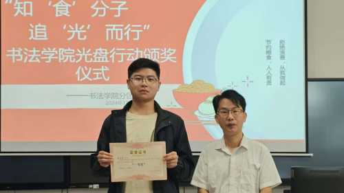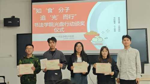 本次“知‘食’分子,追‘光’而行”光盘行动的颁奖仪式于12月4日在南校区艺德楼507书法教研室进行。由书法学院常务副院长苏乃从、党支部书记喻广林、学工办主任兼分团委书记李家琪、实验室主任宁梦宇等领导教师为获奖同学颁奖。