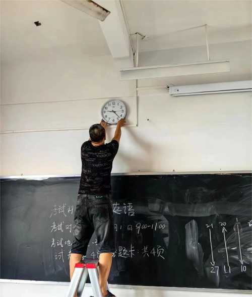 我校将于2023年6月17日举办全国大学英语四、六级考试,为了保证考试顺利进行,后勤保障处于6月15日开展调试考试铃声、检修考场线路、检查考场挂钟等协助工作,确保考试期间使用正常。(姚辉龙/摄)