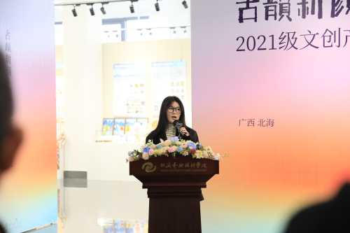《文创产品设计课程》主课教师吴慧霞在发言中对莅临开幕式的领导、嘉宾表示欢迎和感谢,并从展览的主题、课程教学、课程思政、校企合作、课赛结合等方面进行了总结。她表示“古韵新颜”文创产品设计课程展不仅是同学们创意与技艺的结晶,也是对传统文化、海丝精神的传承与创新,更是专思融合的深度探索与实践。