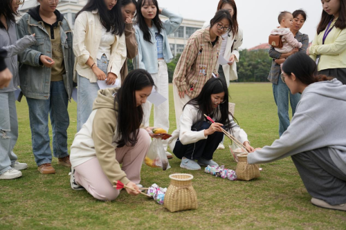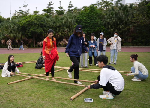 当天,学院师生身着各民族服饰,佩戴精美的配饰,通过民族舞蹈、民族歌曲、民族服装走秀等节目让在场师生“沉浸式”感受到壮乡儿女的独特与风情。此外,还举办了民族文化体验活动,学院师生参加了民族体育竞技、民族美食体验、民族手工艺品展示等活动。现场参与抛绣球、竹竿舞、背篓绣球、溜铁环旱地龙舟、手工绣球制作等民族活动,品尝了具有壮乡特色的民族美食,五色糯米饭、艾叶糍粑、彩蛋等,欣赏到了琳琅满目的民族手工艺品,尽显壮家儿女心灵手巧和热情好客,展现了八桂人民的幸福生活,给现场的师生带来了一场视听盛宴。
