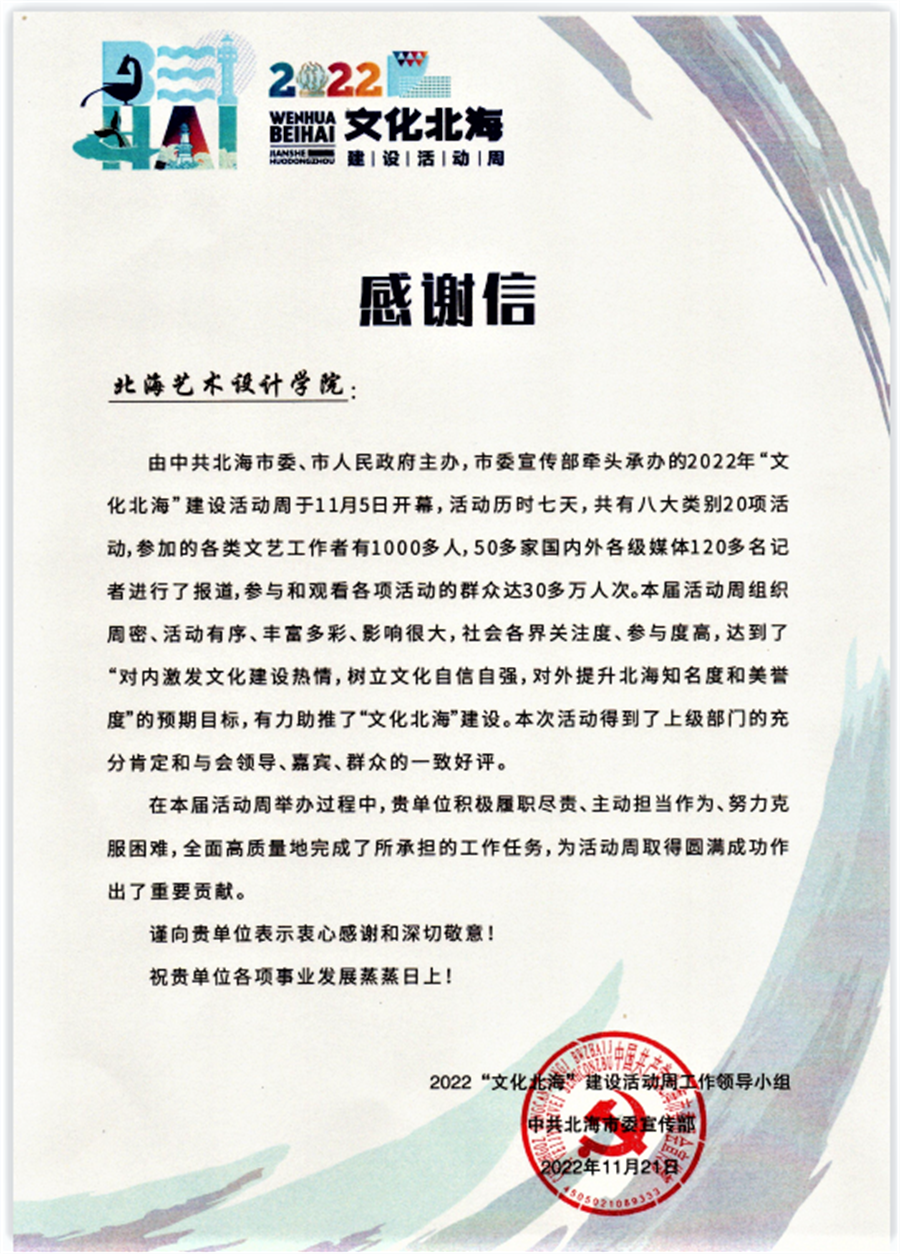 近日,我校收到一封来自“文化北海”建设活动周的感谢信。11月15日晚,2022年“文化北海”建设活动周开幕式在富丽华大酒店拉开帷幕,我校人文教育学院舞蹈表演专业45名学生参加此次活动周演出,北海市2022年“文化北海”建设活动周工作领导小组对我校学生扎实的基本功及舞台表演能力给予高度的认可和赞扬。