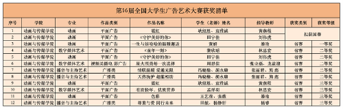 在第16届全国大学生广告艺术大赛中,动画与传媒学院作品《霓虹》荣获国赛三等奖、作品《守护美好的你》荣获国赛优秀奖,《一生与娃哈哈的温暖邂逅》《童年一刻》等10件作品荣获广西壮族自治区省赛奖项。
