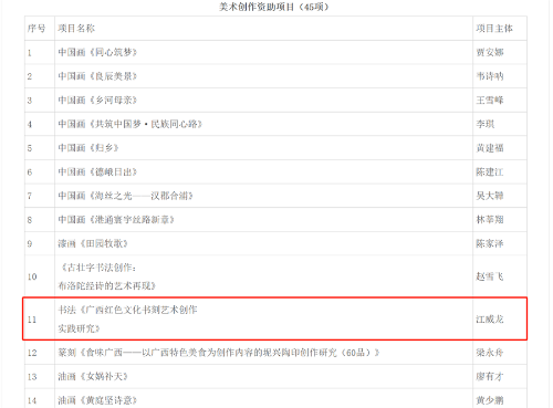 据悉,广西艺术基金是我国第六支、少数民族自治区首支省级公益性艺术基金,广西艺术基金作为广西壮族自治区为推进艺术创作、培养艺术人才而设立的专项基金,每年吸引大量高水平的艺术项目申请。在众多申报项目中,美术创作资助项目有45项获立项资助,3项书法创作人才项目获资助。此次立项实现了我校书法学院在省级艺术基金书法类项目申报“零的突破”,展现了学院艺术创作的核心竞争力。