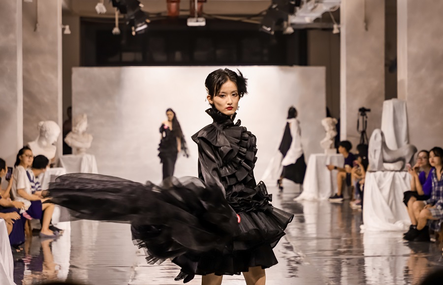 A:现在的社会对设计师的综合能力的要求越来越高了,传统认为服装设计师画好服装效果图,会做一些简单的缝纫,或者会打一些基础版型就可以了。可事实上,这样的毕业生来到社会上,竞争力是非常弱的,很多就找不到工作或者干脆转行了。我认为想要真正进入这个专业并且希望将来可以在这个行业取得一席之地,最重要的是对这个行业抱有极大的热情以及具备较高的审美水平。在这个前提下,再掌握其他的基础技能。以高定班为期两个月的专题设计课的课程设置为例,学生需要具备敏锐的洞察力,在灵感源的获取以及调研的深入过程中能够具备独特的观察视角;要有较强的手绘能力,能快速准确的表达设计思维;要有扎实的制版能力,在做创意设计阶段,尤其需要注重立体剪裁的制版能力;要有工艺制作能力,熟练处理各种面料的各种缝纫工艺;除此之外,在后期还需要学生自己对作品进行宣传,比如定妆照的拍摄,时装秀等等。其中涉及到学生对模特妆容配饰等的整体协调能力,海报宣传册的制作,秀场的设计以及相关的活动组织能力。而上述提到的各项能力也是年轻设计师们步入社会所需要的必备能力,缺一不可。因此也借着课程,希望学生们的各项能力得以锻炼与提高。