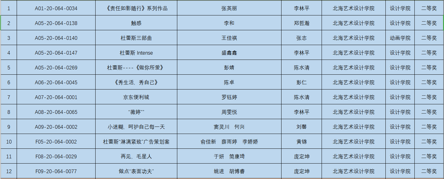 经过一个多月的紧张等待,第十一届全国大学生广告艺术设计大赛广西赛区评审结果终于出炉啦!在刚刚公布的获奖名单中,北海艺术设计学院共计获得了38项等级奖,其中获得一等奖的作品10项、二等奖12项、三等奖16项。本届大广赛,学校还获评为优秀组织院校,刷新了我校参赛的历史好成绩。