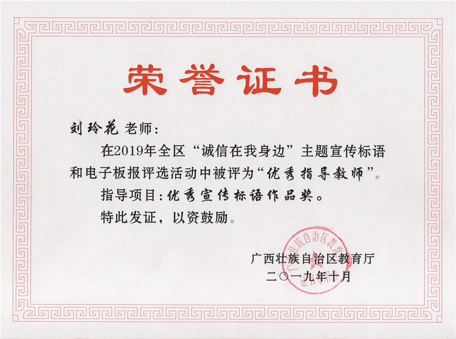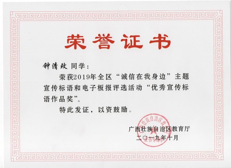 同时,我校建筑学院建筑学专业学生钟清玫荣获2019年全区“诚信在我身边”主题宣传标语和电子板报评选活动“优秀宣传标语作品奖”,刘玲花老师被评为“优秀指导老师”。