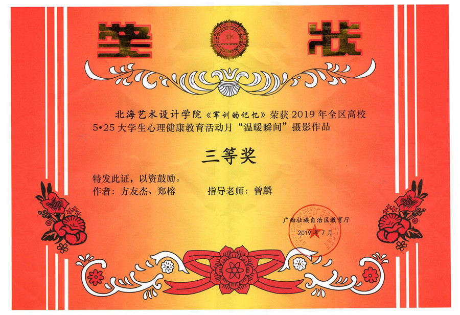 我校设计学院视觉传达设计专业学生方友杰和郑榕的《军训的记忆》(指导老师:曾麟)荣获2019年全区高校5·25大学生心理健康教育活动月“温暖瞬间”摄影作品三等奖。