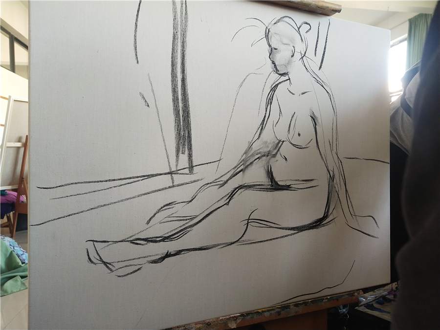 随后,曲教授开始进行示范人体写生步骤,并对创作过程进行了详细讲解。